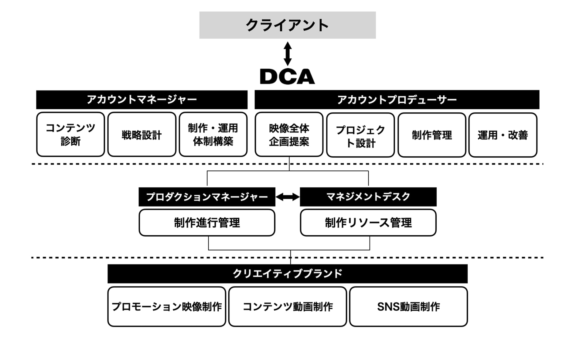 DCAでは、アカウントマネージャー(AM)とアカウントプロデューサー(AP)が課題を深くヒアリングし、最適な制作チームを編成。