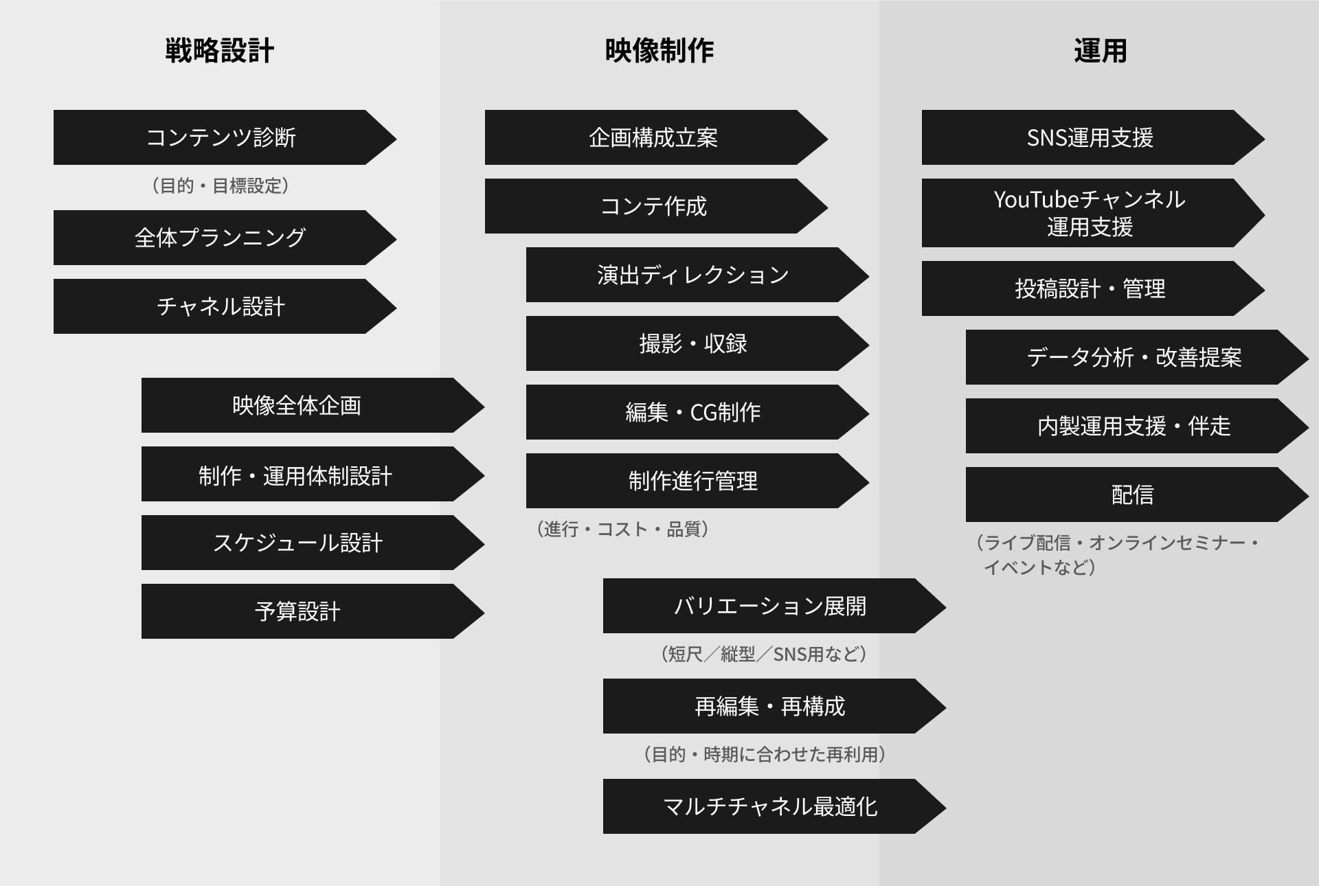 コンテンツ制作に加え、戦略設計から運用・改善、さらには社内体制や仕組みづくりまでを見据えたサポートをお客様に合わせて柔軟に提供します。制作サービスにとどまらず、映像コミュニケーションを継続的に機能させるための支援サービスです。